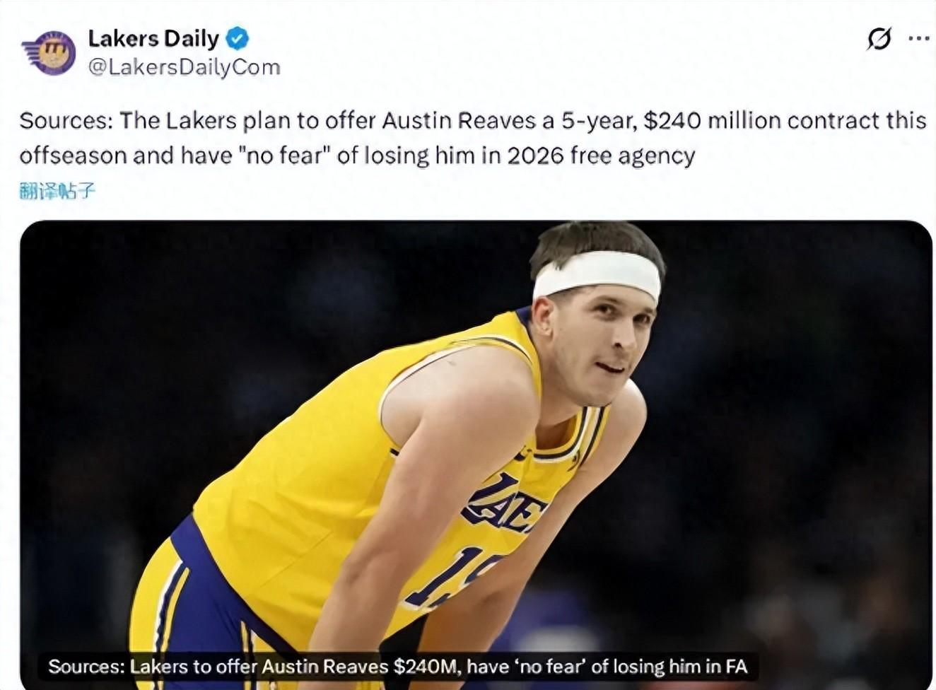 去年夏天,湖人曾为里夫斯提供一份为期4年总额8920万美元的续约合同,但被里夫斯拒绝。后者认为,待到今年夏天,他可以寻求一份为期5年总额超过2亿美金的长约。从眼下的情况看,里夫斯赌对了。